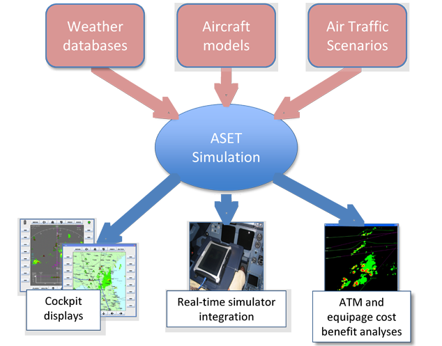 In order to develop and test its products, ATR has developed a unique simulation capability, ASET. This tool combines weather databases (e.g., large domain NEXRAD data), multiple aircraft models (10 different commercial aircraft types), and air traffic scenarios.